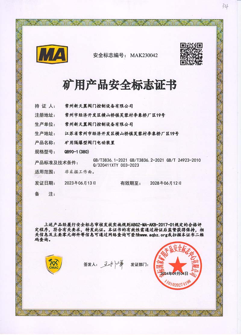 礦用產品安全標志證書QB20-1(380)
